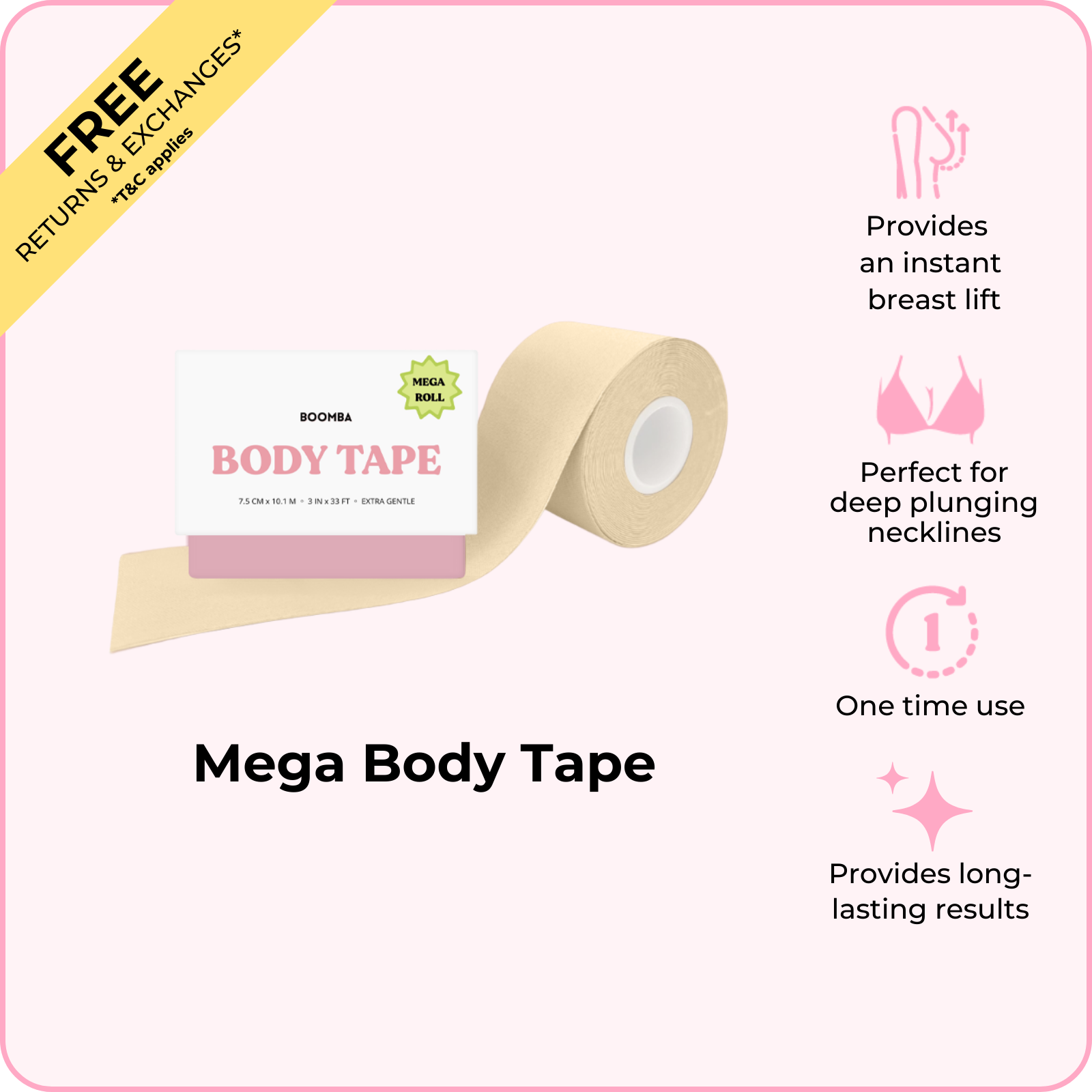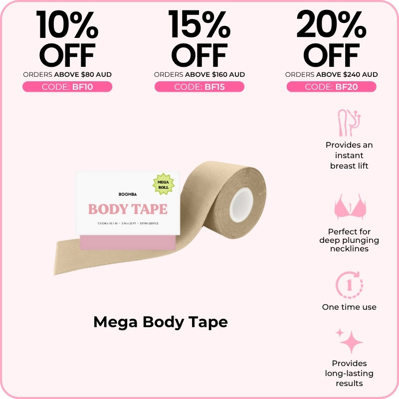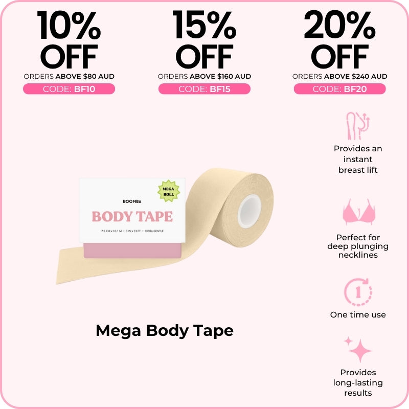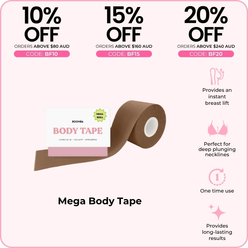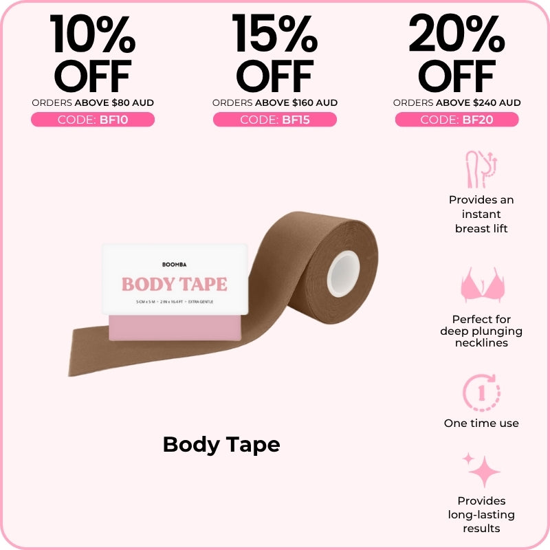 BOOMBA's Body Tape can be worn in various ways. Designed to contour with your shapes, our body tape is gentle yet strong, providing long-lasting results for up to 12 hours.