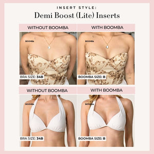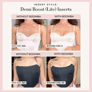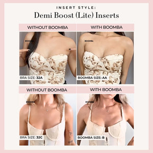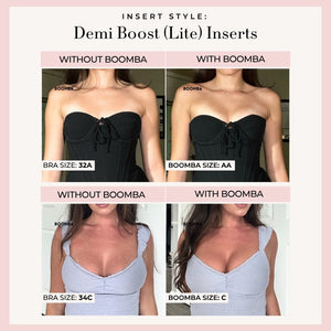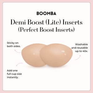 Demi Boost (Lite) Inserts are abalone-shaped inserts that increase your cup size by one cup. They give your bust a fuller look when you wear those plunging necklines and low-cut dresses.