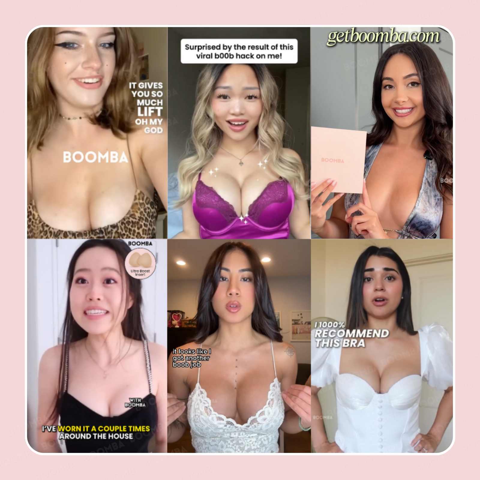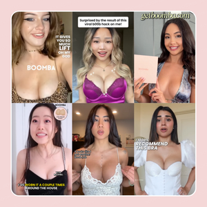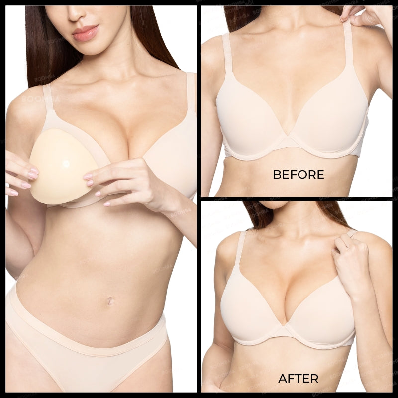 Please note that results may vary depending on breast size and shape. Results will be similar to a double push up bra. BOOMBA’s padded inserts work best with natural breasts.