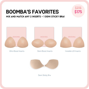 This bundle contains 2 of our best-selling inserts of your choice and the BOOMBA Demi Sticky Bra. Hand-picked as our personal faves, this bundle includes all the essentials you need to look great and feel great on any occasion.