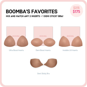 This bundle contains 2 of our best-selling inserts of your choice and the BOOMBA Demi Sticky Bra. Hand-picked as our personal faves, this bundle includes all the essentials you need to look great and feel great on any occasion.