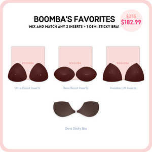 This bundle contains 2 of our best-selling inserts of your choice and the BOOMBA Demi Sticky Bra. Hand-picked as our personal faves, this bundle includes all the essentials you need to look great and feel great on any occasion.