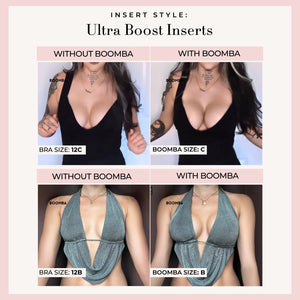 Please note that results may vary depending on breast size and shape. Results will be similar to a double push up bra. BOOMBA’s padded inserts work best with natural breasts.