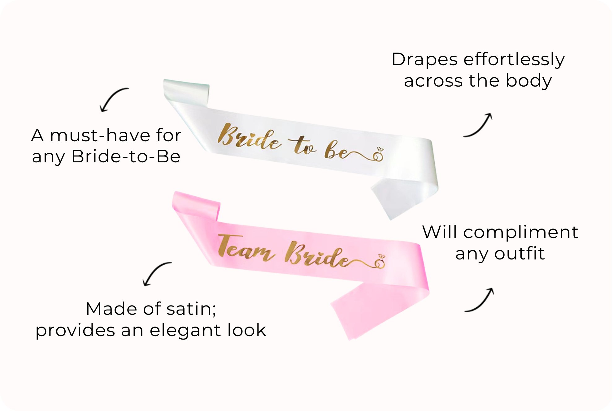 These stunning bridal sashes are just what you need for your girl's night out! Celebrate your engagement in style! You and your bridal party are sure to stand out in the crowd with these fun sashes!