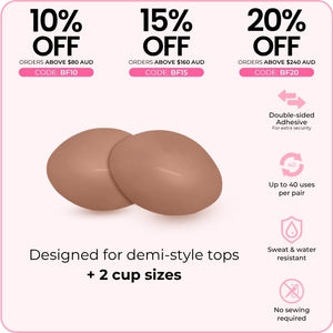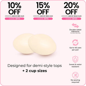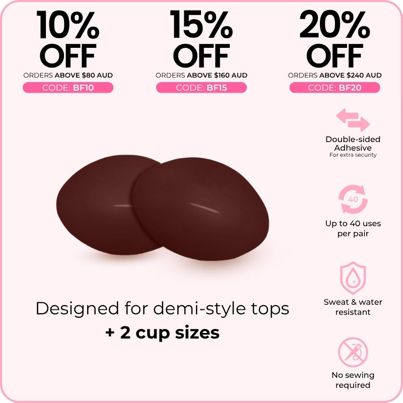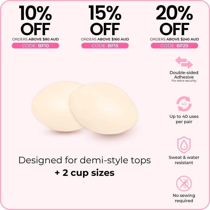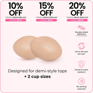 Preparation is key! Before using BOOMBA inserts, please ensure breasts are clean and dry. Any makeup, oil, lotion or other body products may hinder the inserts from sticking onto your skin properly. Put the clothing item on your body first, then place inserts onto the clothing item, then scoop breasts and stick onto the insert to secure.