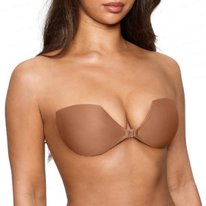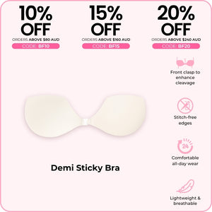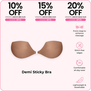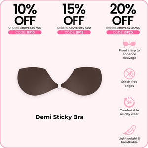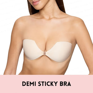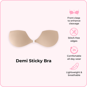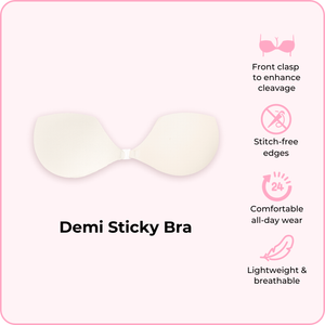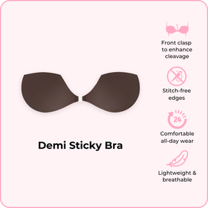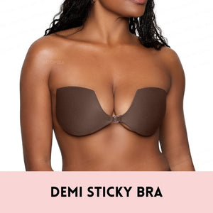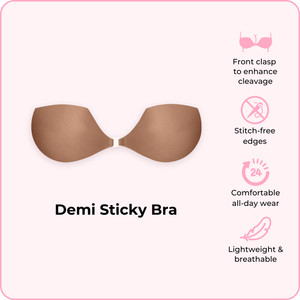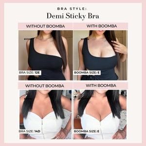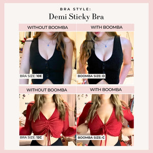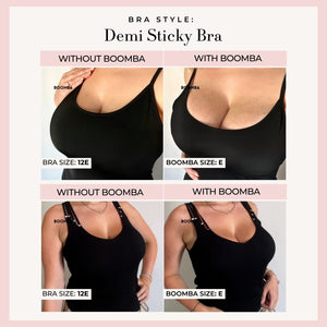 BOOMBA’s Demi Sticky Bra has a unique patented design. The bra cups in our Demi Sticky Bra are cut lower to ensure it always stays hidden under your top. The bra cups mold to fit your natural curves to provide natural-looking cleavage. Its stitch-free edging ensures it stays smooth under your clothing for a seamless look.