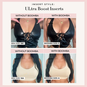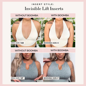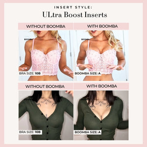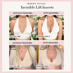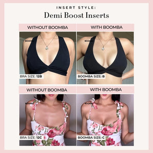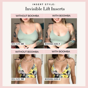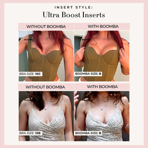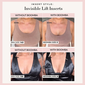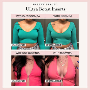 Please note that results may vary depending on breast size and shape. Results will be similar to a double push up bra. BOOMBA padded inserts work best with natural breasts.