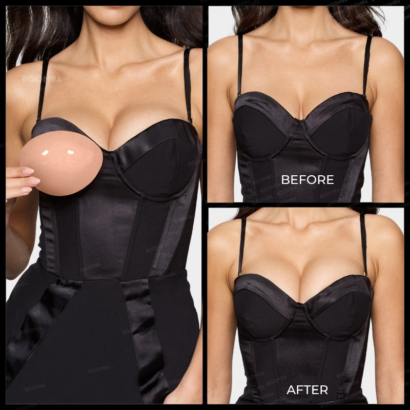 Preparation is key! Before using BOOMBA inserts, please ensure breasts are clean and dry. Any makeup, oil, lotion or other body products may hinder the inserts from sticking onto your skin properly. Put the clothing item on your body first, then place inserts onto the clothing item, then scoop breasts and stick onto the insert to secure.