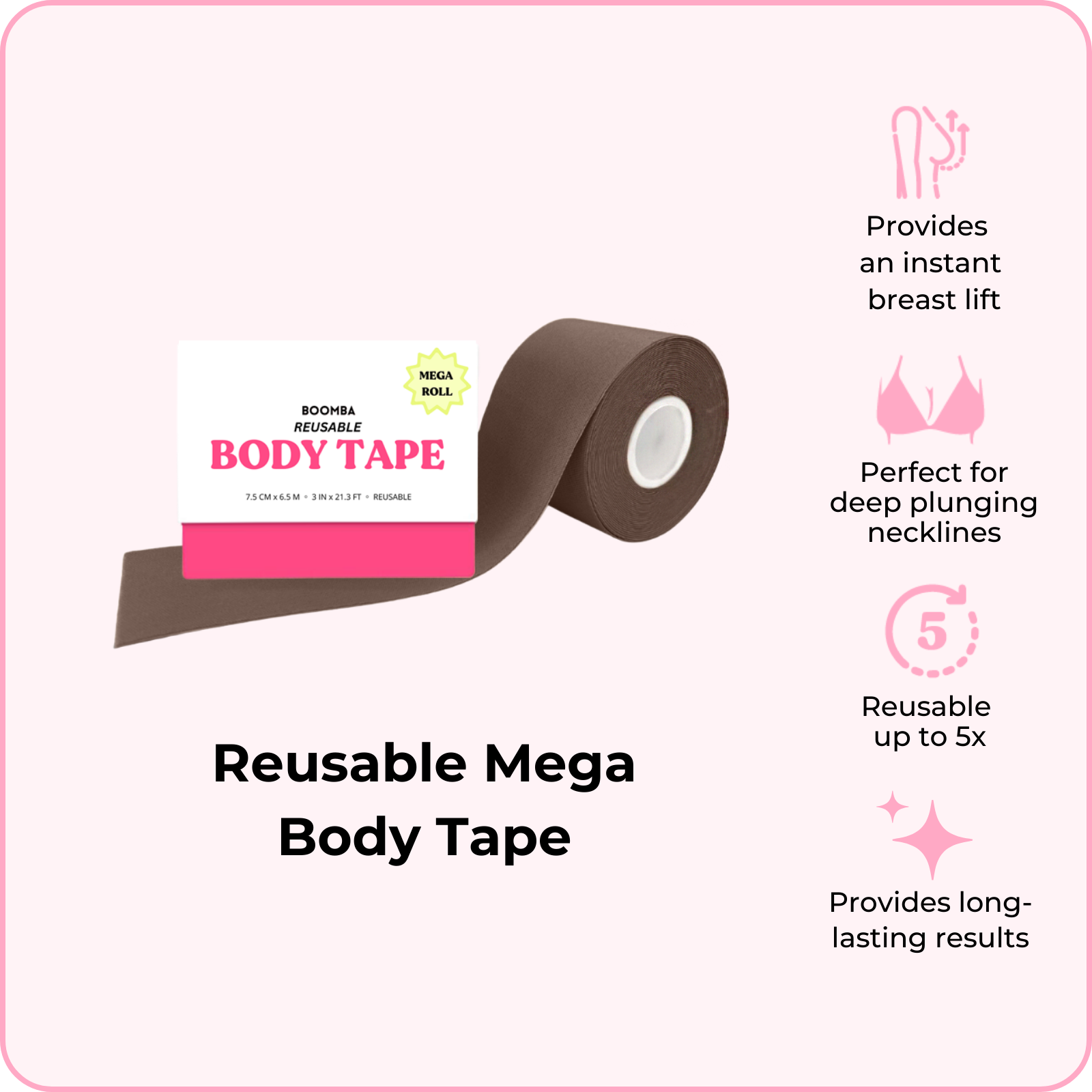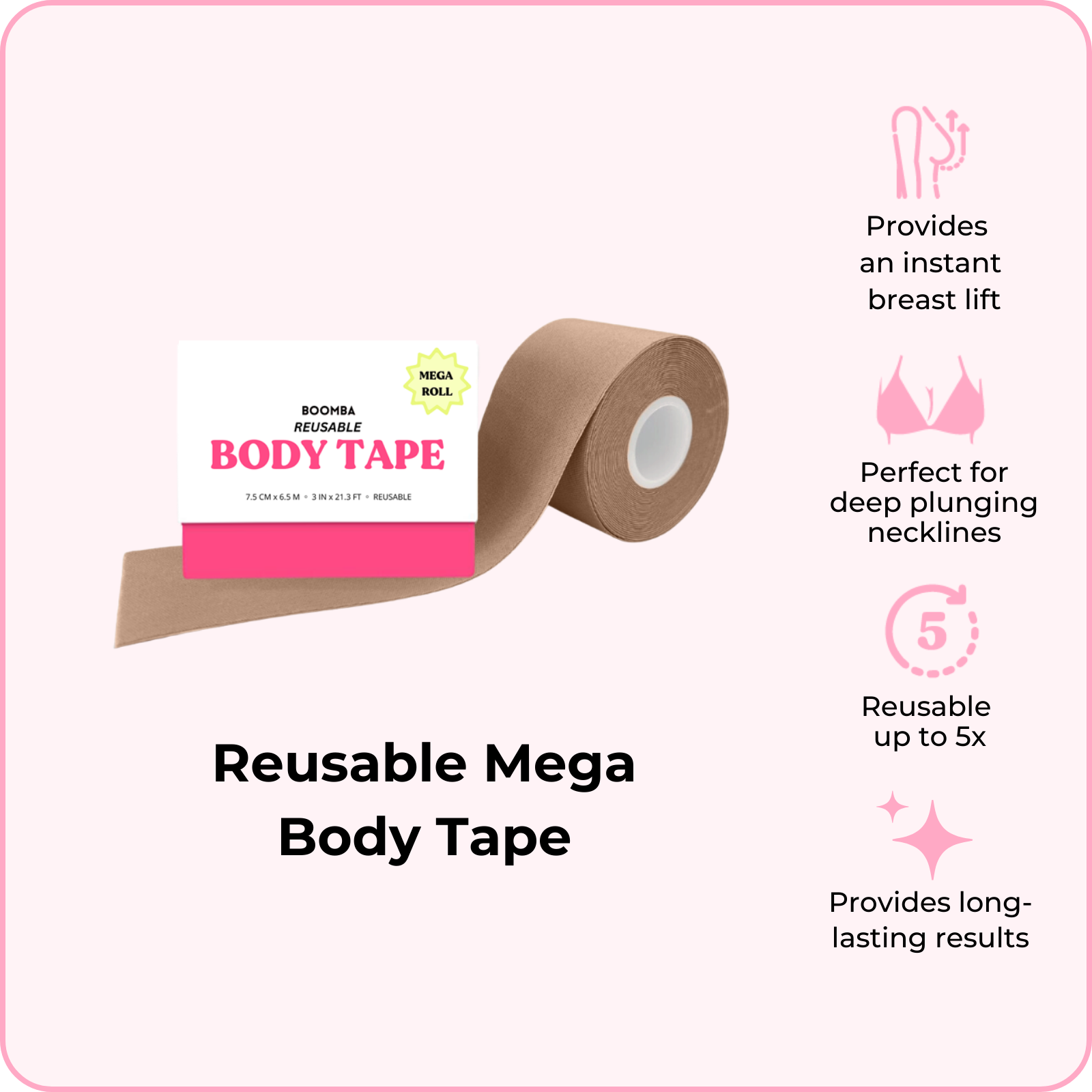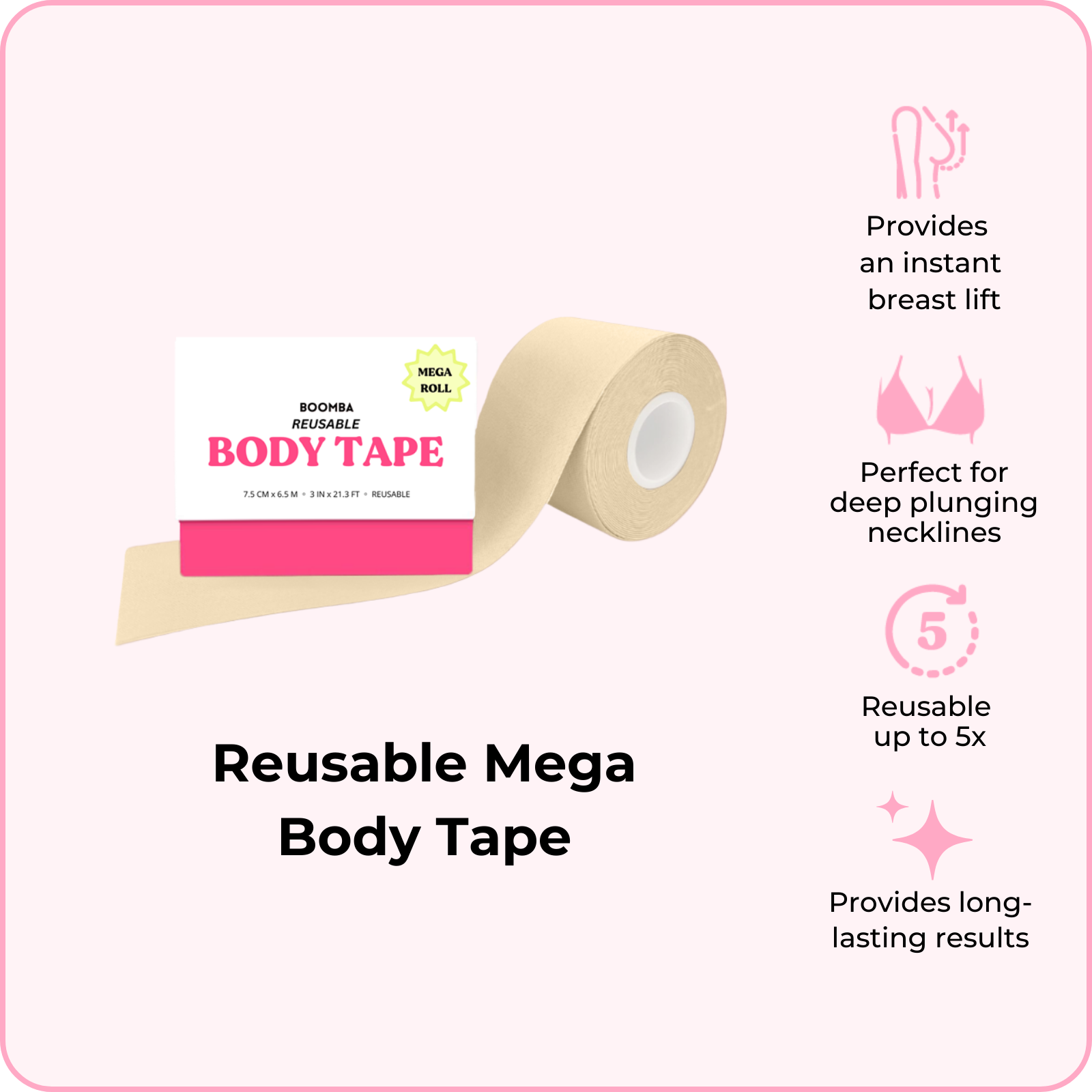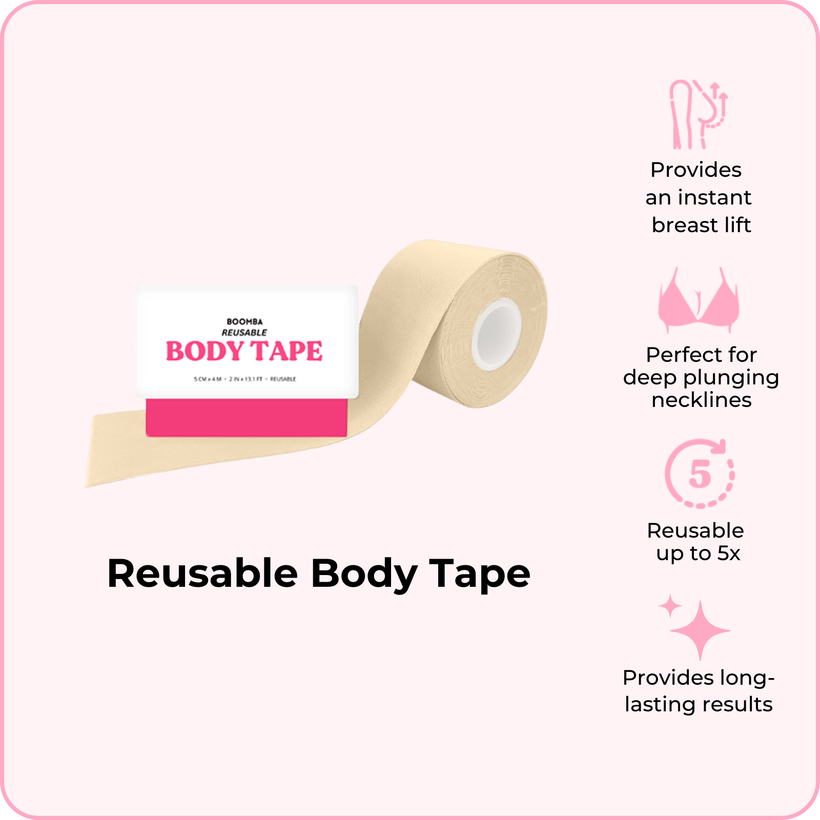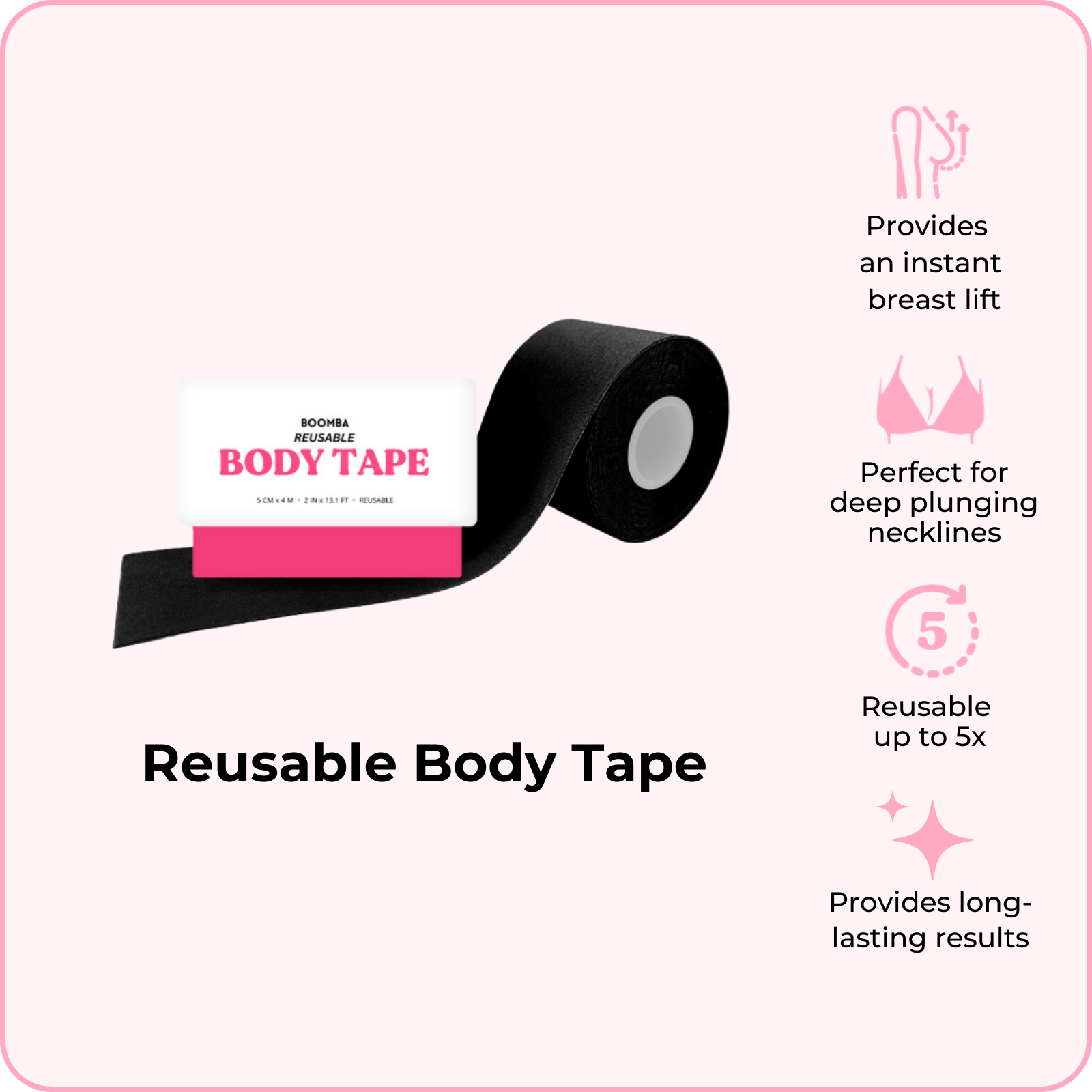 BOOMBA's Reusable Body Tape can be reusable up to five times. Designed to contour with your shapes, our body tape is gentle yet strong, providing long-lasting results for up to 12 hours.