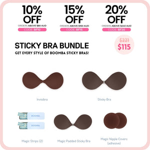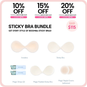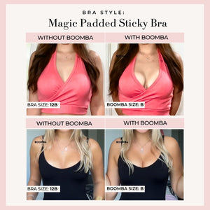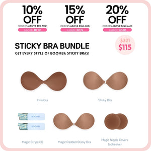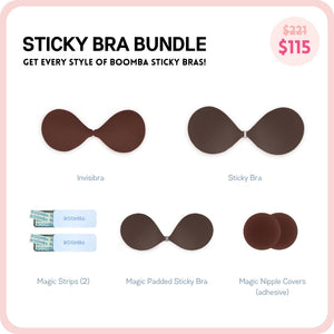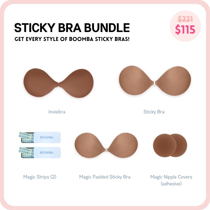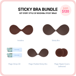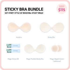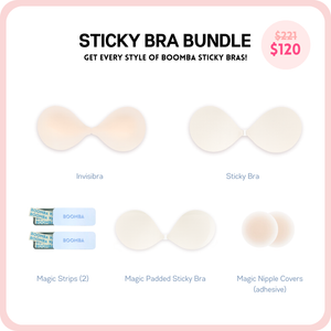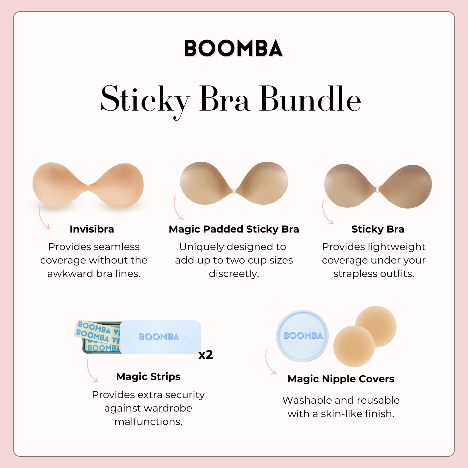 Be prepared for any outfit. This BOOMBA sticky bra bundle includes our best selling Invisibra, Sticky Bra AND our newest addition, the Magic Padded Sticky Bra! It also includes our famous Magic Nipple Covers, along with 2 tins of BOOMBA Magic Strips.
