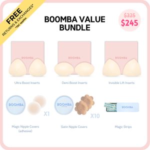 This bundle contains all three styles of our popular inserts, Ultra Boost, Demi Boost, and Invisible Lift. It also contains our best-selling Magic Nipple Covers (adhesive), Satin Nipple Covers, and BOOMBA Magic Strips.