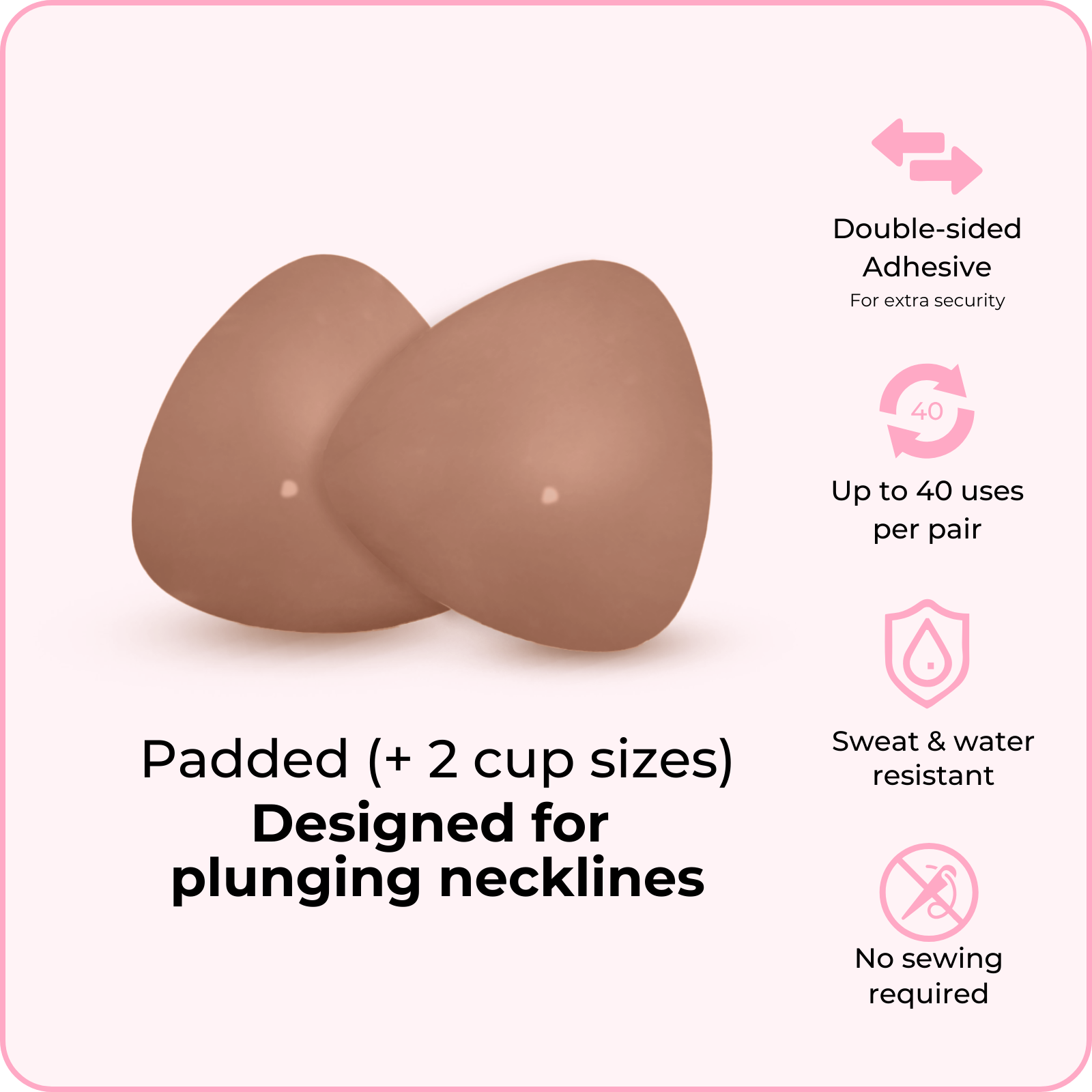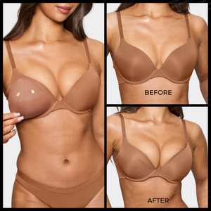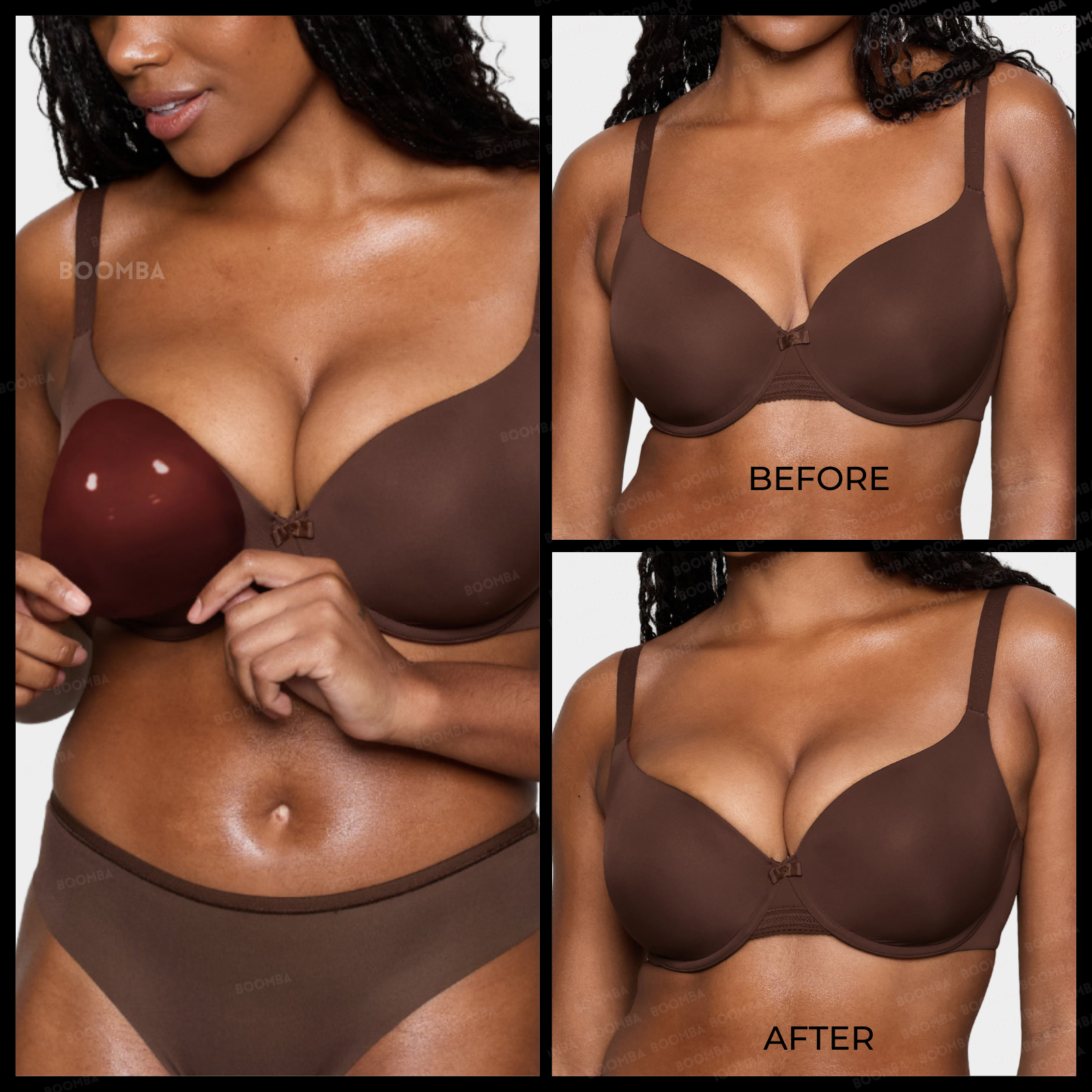 Please note that results may vary depending on breast size and shape. Results will be similar to a double push up bra. BOOMBA’s padded inserts work best with natural breasts.